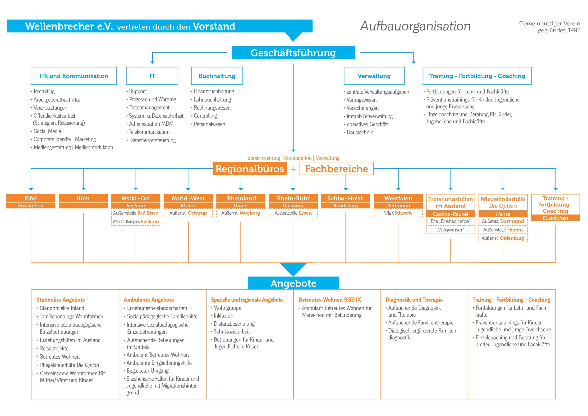Wellenbrecher verfügt zum einen über horizontale Strukturen, die sich in den Regionalbüros an unterschiedlichen Standorten mit dem Schwerpunkt in Nordrhein-Westfalen wiederfinden und die in der Regel über ein breit gefächertes Angebot an stationären und ambulanten Hilfen verfügen. Zum anderen gibt es vertikal, an Aufgabengebieten orientierte Fachbereiche mit zentralisierten, überregionalen Zuständigkeitsbereichen. Dazu zählen etwa die Auslandsabteilung mit Sitz im Büro Emscher, die Pflegekinderhilfe Die Option in Herne sowie der Fachbereich „Training – Fortbildung – Coaching“, der in Euskirchen am Standort des Regionalbüros Eifel ansässig ist.